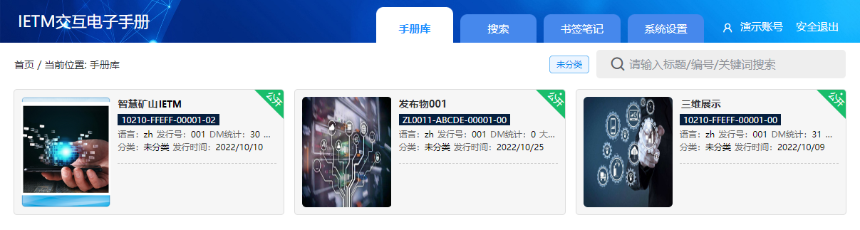 交 互 式 电 子 技 术 手 册 (Interactive Electronic Technical Manual),是一种应用计算机技术设计制作、以数字化形式存储,通过人机交互方式提供装备基本原理、使用操作和故障维修等内容的电子技术出版物。同时由于其独特信息编码关联机制设计,和自适应交叉引用的数据存储冗余优化,早期主要用于航空航天、国防装备、船舶工业等大型装备智能制造业的产品制造和综合保障领域范围内。